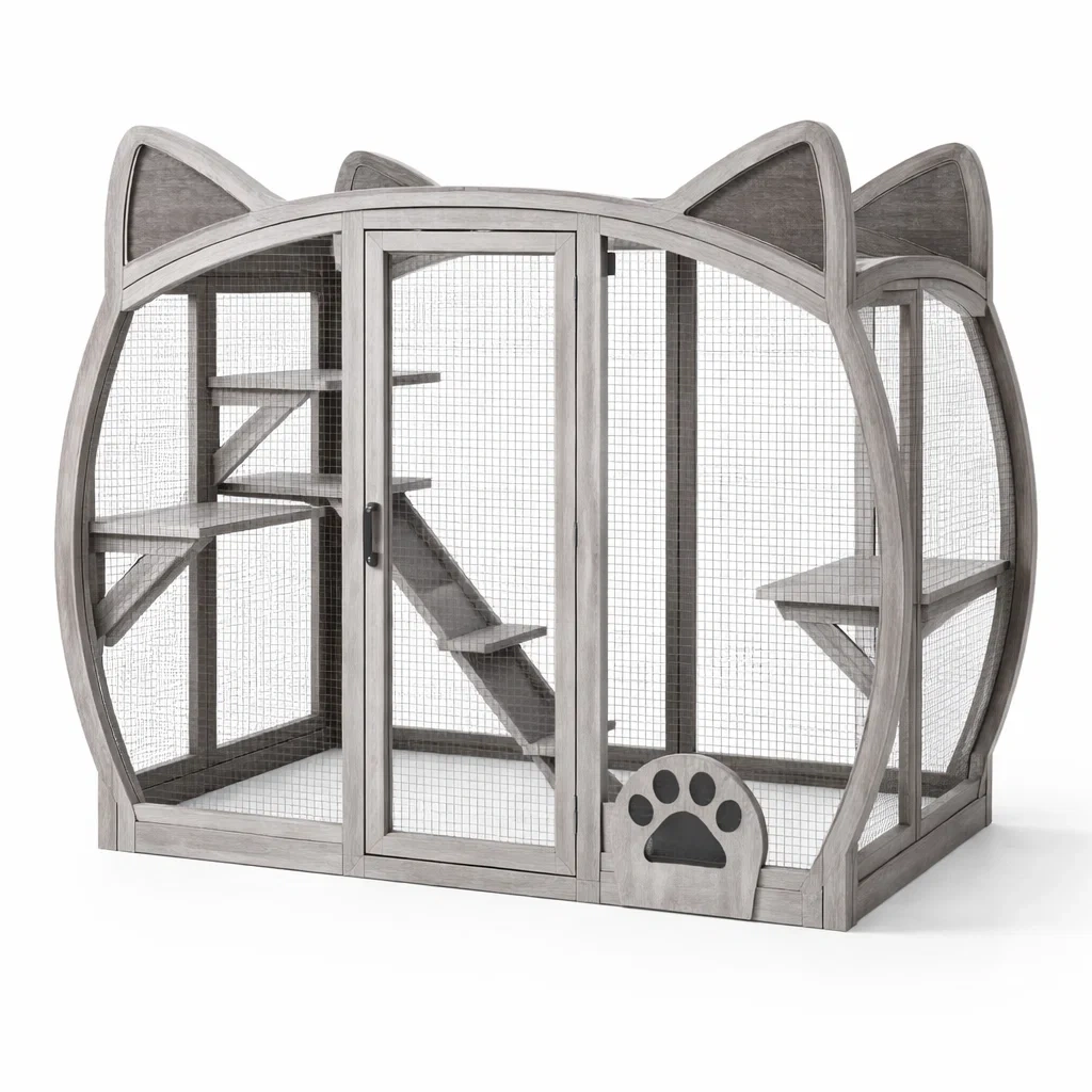 Cage à chat en bois de sapin avec grillage métallique forme tête de chat gris